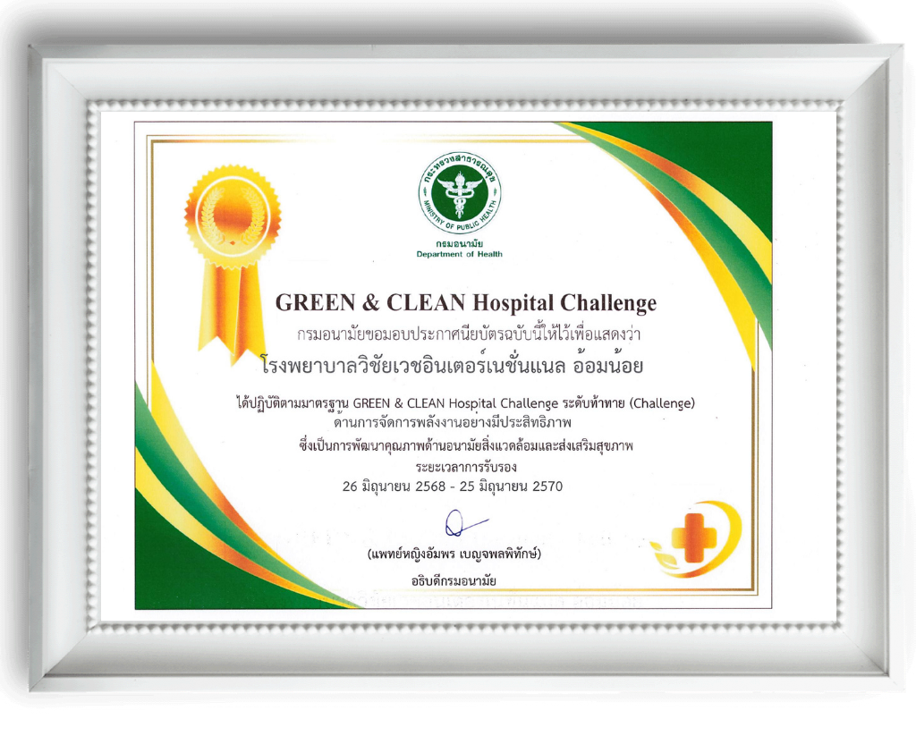 GREEN & CLEAN Hospital Challengeโรงพยาบาลวิชัยเวช อินเตอร์เนชั่นแนล อ้อมน้อย เดินหน้ายกระดับมาตรฐานสถานพยาบาลที่เป็นมิตรกับสิ่งแวดล้อมอย่างยั่งยืน ล่าสุดเข้ารับมอบประกาศนียบัตรรับรองมาตรฐาน “GREEN & CLEAN Hospital Challenge” ระดับท้าทาย (Challenge) ประจำปีงบประมาณ 2568 จากกรมอนามัย กระทรวงสาธารณสุข
