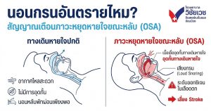 A: เสียงกรนที่อันตรายคือเสียงกรนที่ดังมาก ไม่สม่ำเสมอ และมีจังหวะเงียบหายไปชั่วขณะ (หยุดหายใจ) ก่อนจะตามมาด้วยการสะดุ้งเฮือกเพื่อสูดอากาศ หากเกิดภาวะนี้บ่อยครั้ง จะทำให้สมองขาดออกซิเจนและหลอดเลือดเสื่อมสภาพ เพิ่มความเสี่ยงอัมพฤกษ์อัมพาตได้สูงมาก