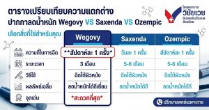 | หัวข้อเปรียบเทียบ | Wegovy (เวโกวี่) | Saxenda (ซักเซนดา) | Ozempic (โอเซมปิก) |