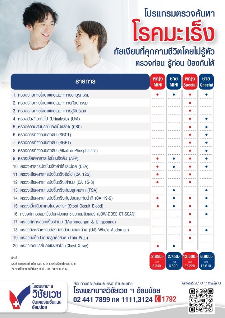 โรงพยาบาลวิชัยเวชอ้อมน้อยได้มีการใช้เทคโนโลยี Google Analytics และ Facebook Pixel ซึ่งมีวัตถุประสงค์เพื่อใช้เก็บข้อมูลเชิงลึกเกี่ยวกับรูปแบบการใช้งานของคุณบนเว็บไซต์ของเรา โดยข้อมูลนี้ประกอบไปด้วย หน้าเว็บไซต์ที่คุณเข้าชม ลิงค์ที่คุณคลิก ระยะเวลาที่คุณเข้าชมแต่ละหน้า โดยเราใช้ข้อมูลนี้เพื่อวิเคราะห์รูปแบบการใช้งานของผู้ใช้ และเพื่อให้เว็บไซต์ทำงานได้อย่างถูกต้อง เราขอยืนยันว่าจะไม่ใช้ข้อมูลนี้เพื่อการตลาดหรือการโฆษณา และจะไม่เปิดเผยกับบุคคลที่สามแต่อย่างใด
